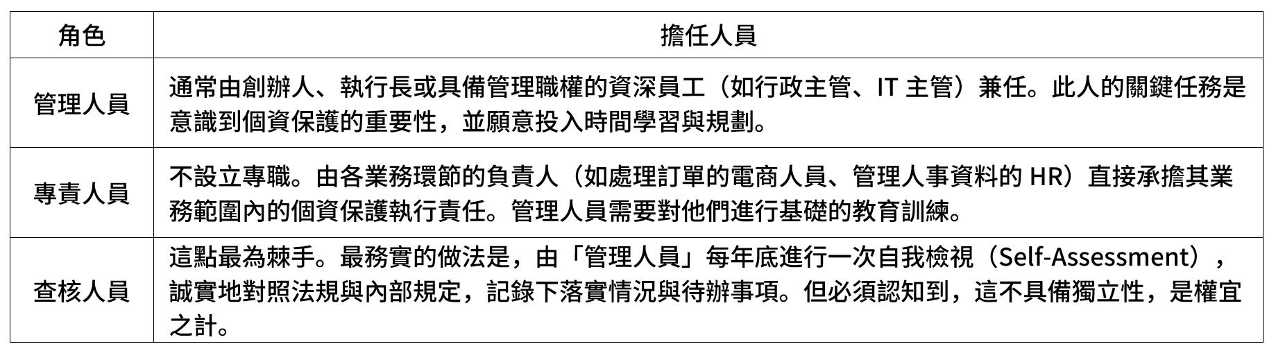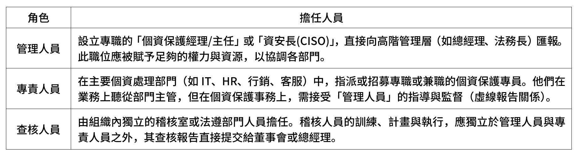 回到我們最初的問題:「個人資料保護專責人員、管理人員、查核人員的區別是什麼?」