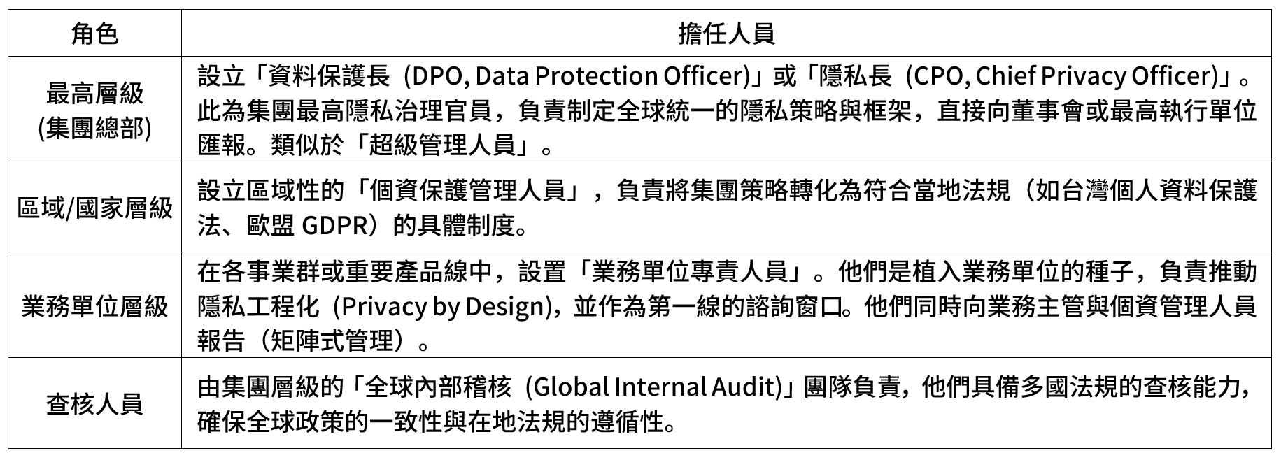 對於業務遍及全球、資料處理極其複雜的大型集團,其架構更強調中央集權的策略指導與在地化的彈性執行。